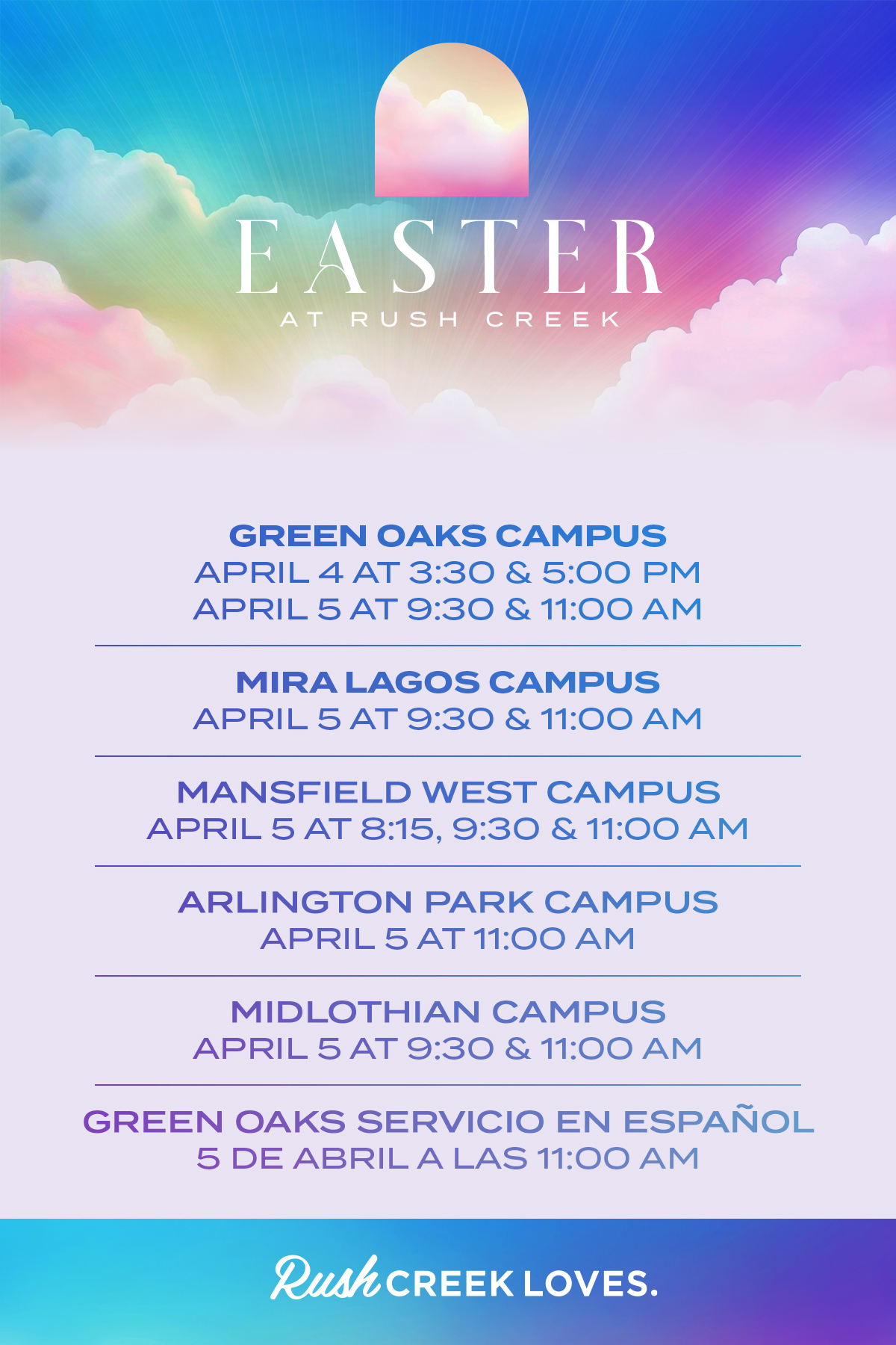 We can’t wait to celebrate our Risen King! We invite you to join us at any of our local campuses for Easter Weekend at Rush Creek.